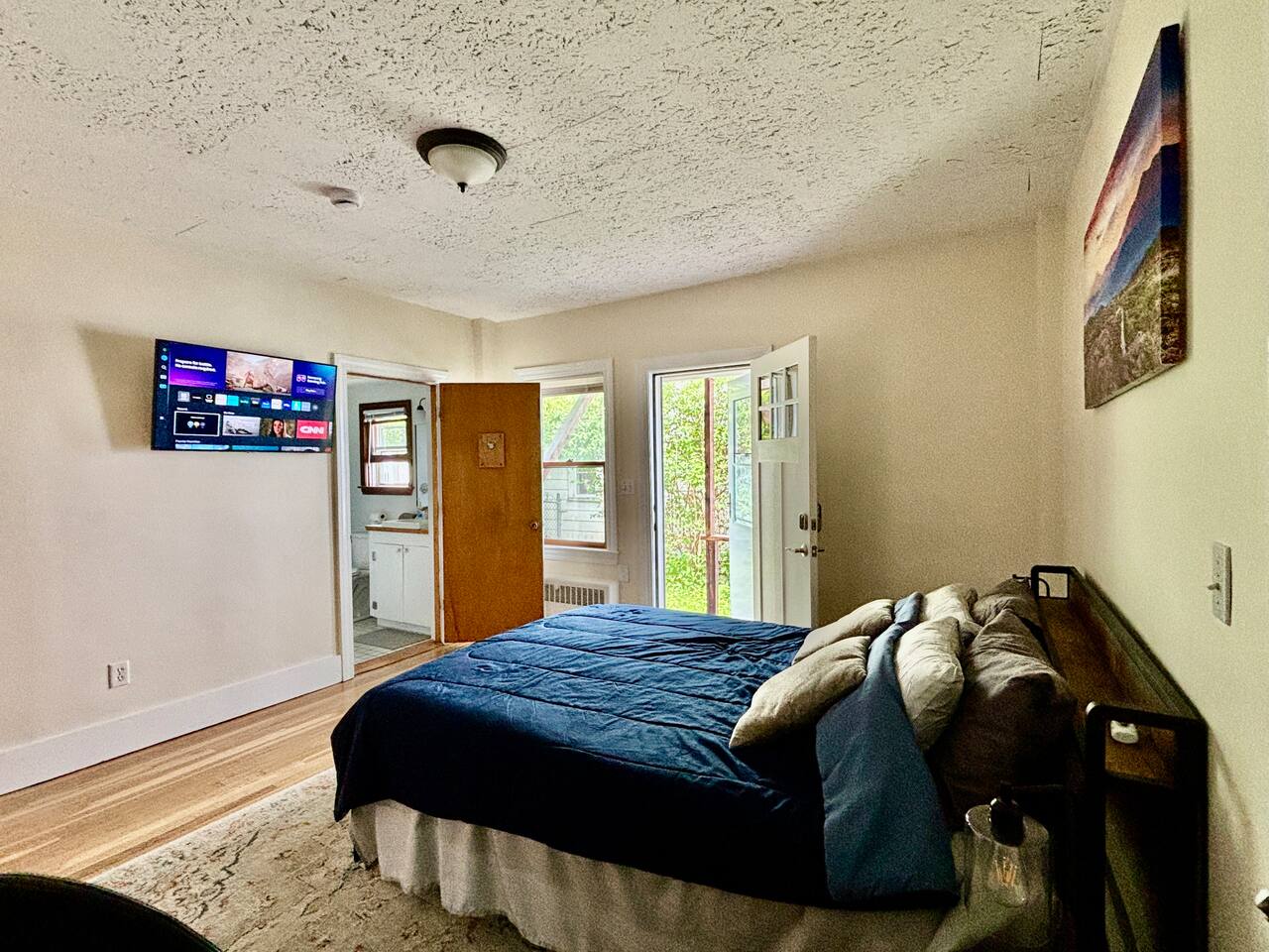 Ground-level bedroom with private entrance and attached full bath. Queen-size bed, TV with YouTube TV channel streaming. AC, heating. Linens, towels, soap, shampoo, conditioner are provided. Work desk for your laptop. Mini fridge, microwave, coffee maker with K Cups Access to washer and dryer. One-car parking (reservation required before arrival, no additional cost), and a level 2 fast EV charger.